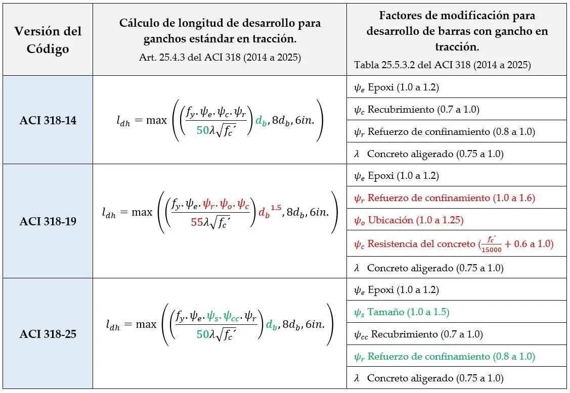 Tabla 4: Comparativa cálculo de longitud de desarrollo para ganchos estándar en tracción AC1 318 (2014 a 2025)