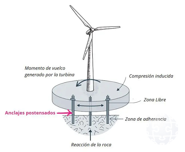 Los anclajes postensados a roca representan una solución eficiente y segura para cimentaciones de turbinas eólicas en terrenos rocosos, al combinar rigidez estructural, control del agrietamiento y optimización de materiales.
